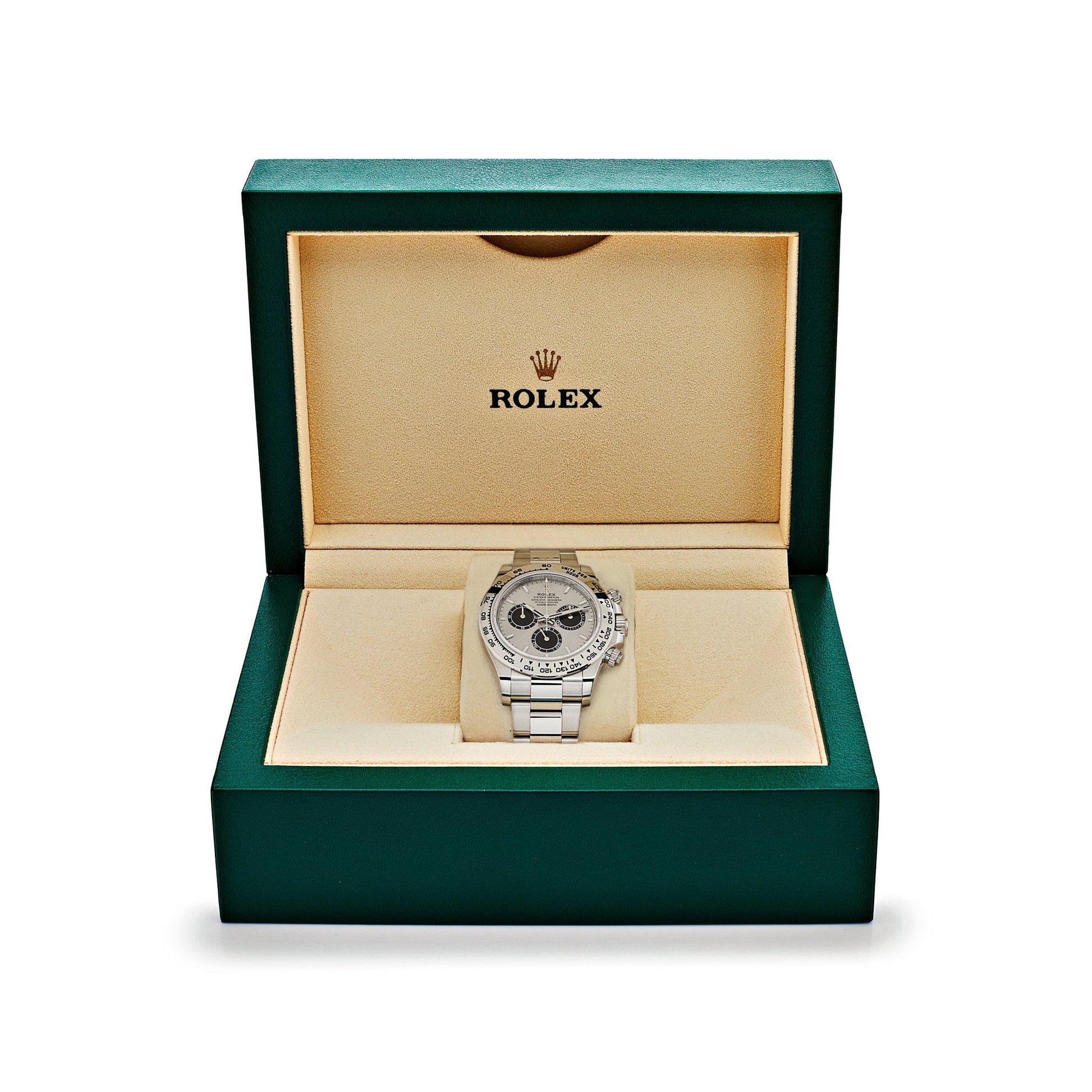 This 2025 Watch Daytona 126509 'Ghost' is designed in a 40mm 18-carat white gold case. it features a silver dial with bright black subdials and 18 ct gold applique hour markers. The second hand allows accurate reading. while the two counters on the dial display the elapsed time and hours. This beauty is housed on an 18ct white gold Oyster bracelet with Oysterlock folding-clasp.?